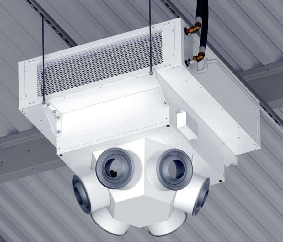 حلول تدفئة وتبريد قائمة على الماء (هيدروليكية) للقاعات الصناعية والتجارية الكبيرة. تشمل وحدات تعليق سقفية وجدارية فعالة لإعادة توزيع الحرارة والتكييف.